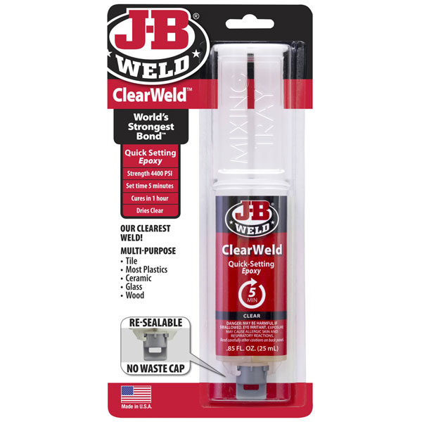 J-B Weld ClearWeld™ Epoxy Syringe is a quick setting, multipurpose two-part epoxy providing a strong and lasting bond on most surfaces including tile, most plastics, ceramic, glass, wood and metal. Designed to cure with a clear, transparent bond when used at thicknesses of less than 15mm.