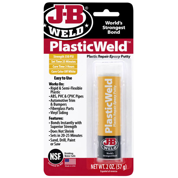 J-B Weld PlasticWeld™ Epoxy Putty is hand-mixable and fast-setting, only 5 minutes. After mixing, it forms a polymer compound which can be moulded or used to build up and repair just about anything made from plastic. When cured, it can be sawed, drilled, carved, sanded and painted. Resistant to water, chemicals and heat.