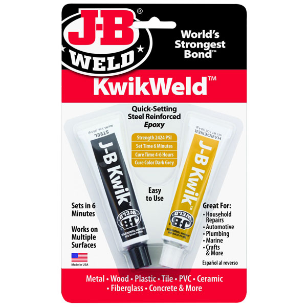 J-B Weld KwikWeld™ Epoxy Adhesive provides strong, lasting repairs to metal and multiple other surface types. Sets within minutes and cures within just a couple of hours. Cures consistently, no shrinkage or foaming.