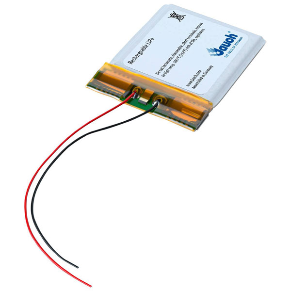 The Jauch Quartz LP333437JU is a non-standard rechargeable prismatic LiPo battery with a capacity of 430 mAh and a voltage of 3.7 V. It features a soft cell pouch design and comes equipped with a built-in cable for easy integration. This battery is typically used in industrial rechargeables and custom-built applications where standard battery sizes do not fit.