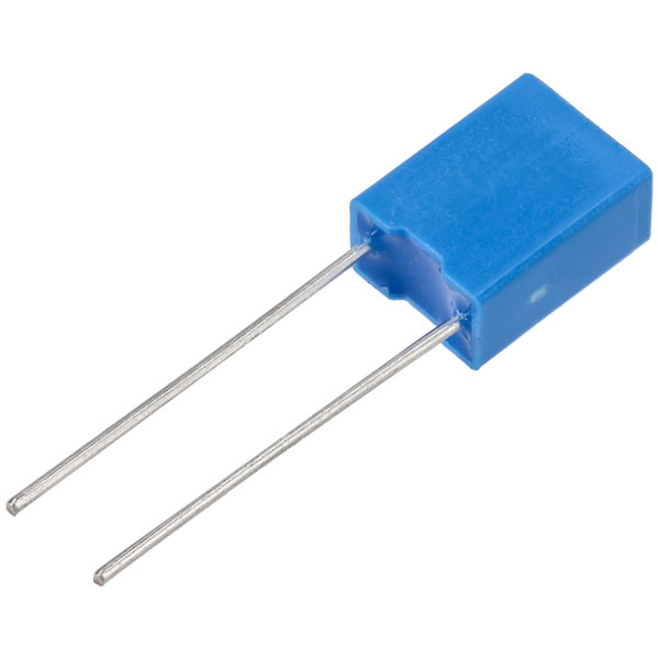 A 0.39uF 100V miniature radial box type metallised polyester film capacitor.