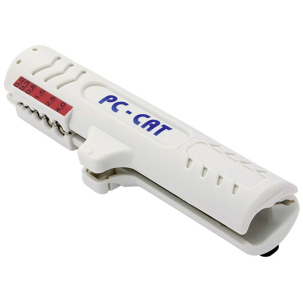 The Jokari 30161 PC CAT cable stripper is designed for use with round cables, including CAT5, CAT6, and CAT7 types. It supports twisted pair cabling with diameters ranging from 4.5 to 10 mm and conductor sizes from 0.2 to 0.8 mm². This tool is ideal for both professional and DIY applications involving precise cable stripping.
