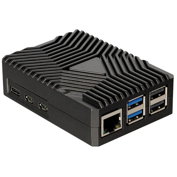 This noble aluminum casing is very robust and protects your Raspberry Pi® 5 B perfectly against external influences. It has recesses for all connections that make this accessible. The channel trimming on the top side serves as a heat sink Outside and inside the chassis, areas are located on the processor and memory to maximize cooling results.