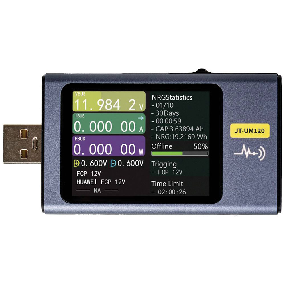 The JT-UM120 is the digital all-round multimeter. USB connections often differ greatly in their quality and available performance. With the JT-UM120 you can easily keep an eye on all measurements and also have a quick-charge trigger for mobile communication devices. The versatile display modes, like overview measurements, detailed measurements and real-time graph-view, offer especially many analysis possibilities. Additional functions such as the evaluation via a separate PC software, automatic, orientation-controlled display rotation, cable resistance measurements round off the complete package.