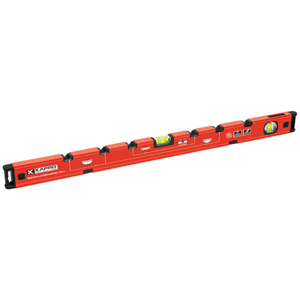 This level has markers on the profile at standard sink installation points: 280mm for sink attachment to wall, 150mm for tap placement and 75mm for water pipes below the sink. The level has shock absorbing rubber end caps on either end to prevent the level from getting damaged if it is dropped. Kapro's wall grip feature allows you to keep the level against a flat surface with one hand without scratching or damaging the wall.