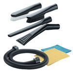 The 7-piece kit includes the following: extension hose (1.5m), extra-long crevice tool (350mm), car vacuuming tool, suction brush with soft bristles (for dashboard and plastics), suction brush with hard bristles (for carpet and upholstery), window cleaning chamois and microfibre polishing cloth.