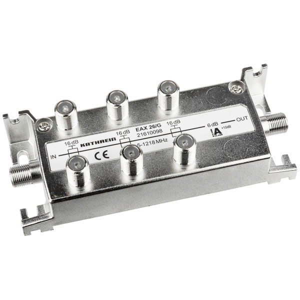 Kathrein 21610098 is as a high-performance Cable TV distributor, designed for effective signal distribution in complex coaxial networking systems. Designated as a 4-way distributor, it operates within a frequency range of 5 to 1218 MHz, making it suitable for both analogue and digital signal distribution applications including television, internet, and radio services. The Kathrein EAX 26/G is engineered to provide robust signal integrity and minimal noise interference, ensuring optimal performance in demanding environments. This component is typically utilised in residential and commercial antenna installations, where reliable multipoint signal distribution is necessary. The product's precision construction and compliance with industry standards make it ideal for integration into existing infrastructure while supporting future technological advancements.
