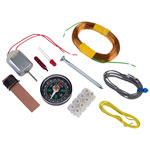 • Kit includes: compass with coil for current indicator, small lamp, LED with integrated resistor, electric motor, terminals, zinc nail, copper board 10 x 50mm, connecting wire and detailed instructions