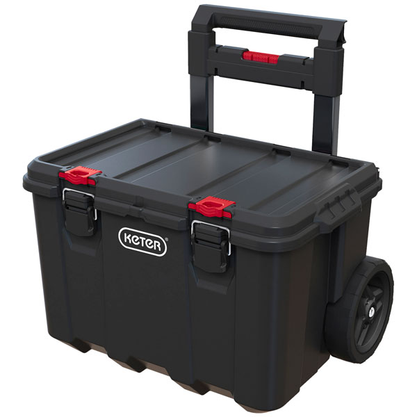 The Keter Stack N Roll Cart comes with ergonomic one-click release button handle and side grips for secondary lifting option. Its durable 7in wheels provide stable transportation. Heavy-duty metal latches allow you to securely fasten the lid with audible closing indication.
