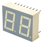 Dual digit 14.2mm (0.56in high) seven segment display from Kingbright with grey face, white segments and green display.