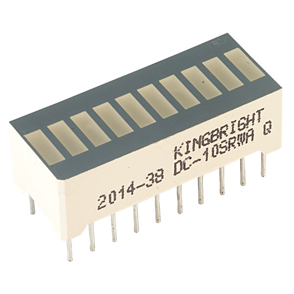 A ten element bar graph display comprising ten intensity matched super bright red LEDs housed in a 20-pin DIL package to form a neat compact display which may be end stacked to create bar graphs of various lengths. GaAsP/GaP emitting colour material, excellent ON/OFF contrast.
