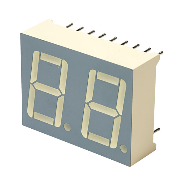 Dual digit 14.2mm (0.56in high) seven segment display from Kingbright with grey face, white segments and green display.