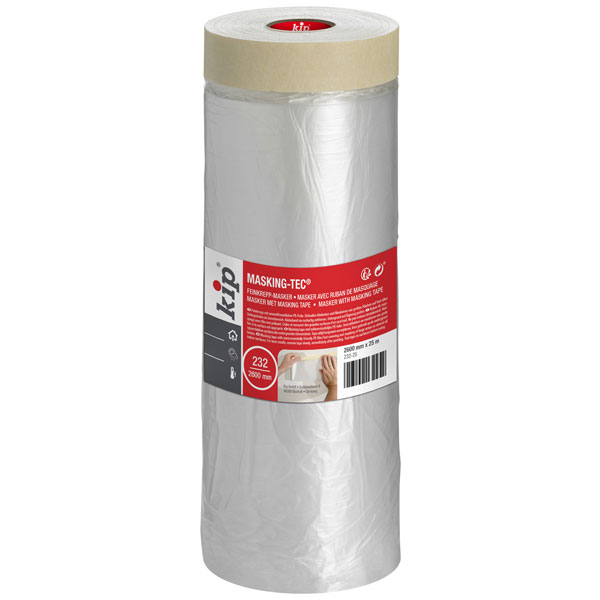 This KIP® 232 Plastic Masker Tape is made from environmentally friendly PE film. The film attaches itself to the substrate through static charge. Designed for quick and full covering and masking of large surface areas. Ideal for masking walls, windows, doors and furniture. Perfect for use with emulsion and when spray painting.