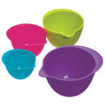 Perfect for transferring, combining and preparing your recipe ingredients, these hygienic and flexible mixing bowls with an integral pouring lip come in a set of 4 different colours and sizes. The four Colourworks colours green, blue, pink and purple are sure to brigthen up your kitchen and can be co-ordinated with a range of other items in the Colourworks range, allowing you to mix, match and co-ordinate your kitchen in a striking array of colours. Ranging from 210ml to 840ml capacity, the mixing bowls are heat resistant to 260°C/500°F.