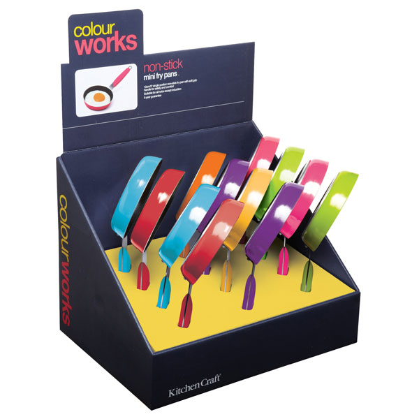 The counter top display includes twelve Colourworks mini non-stick frypans.
