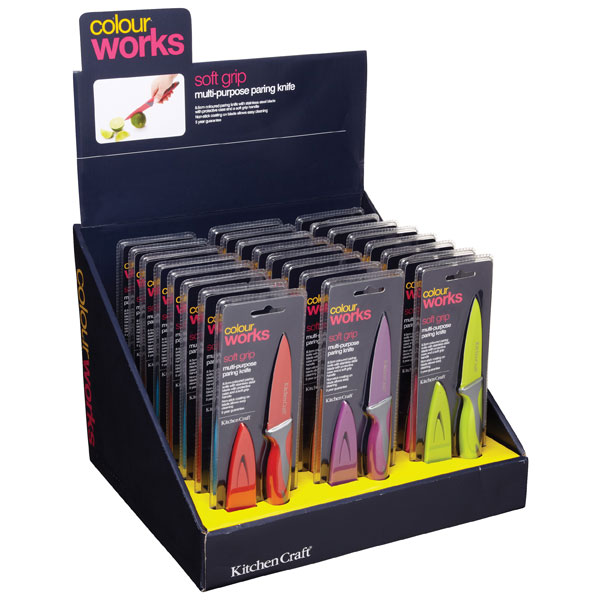The counter top display includes twenty-four clam packed multi-purpose paring knives with non-stick coated durable stainless steel blades.