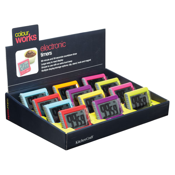 The counter top display includes twelve assorted coloured Colourworks countdown timers.