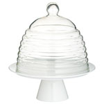 This elegant cake stand is perfect for presenting and serving your favourite cakes, desserts, biscuits and pies. A beautifully shaped porcelain footed base complete with a glass beehive style ribbed domed lid give this stand its unique look. The lid not only acts as a cover, but also leaves the cakes clearly visible for temptation.