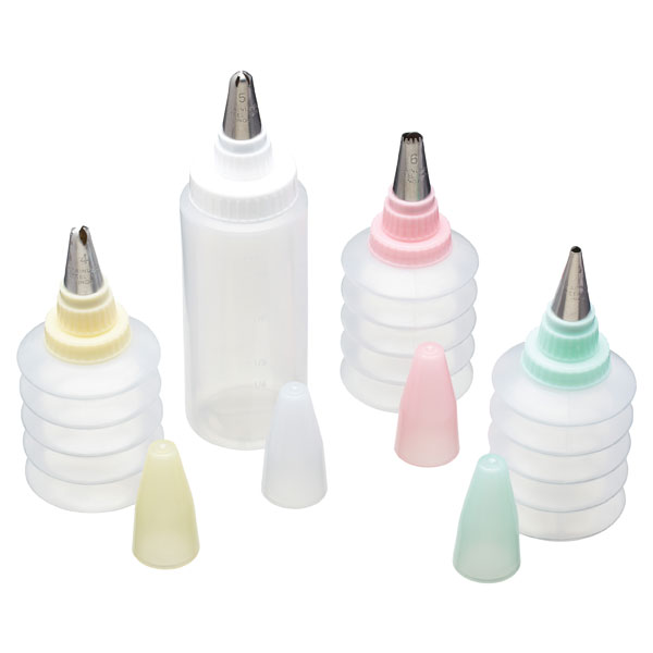 Set comprises: 4 icing bottles, 4 icing nozzles and lids