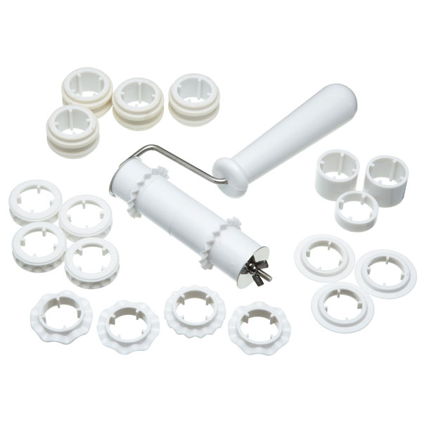 Set includes: roller, 9 x spacers, 4 x stripe wheels, 4 x bead wheels, 3 x ridged wheels, 3 x wavy wheels, 3 x straight wheels