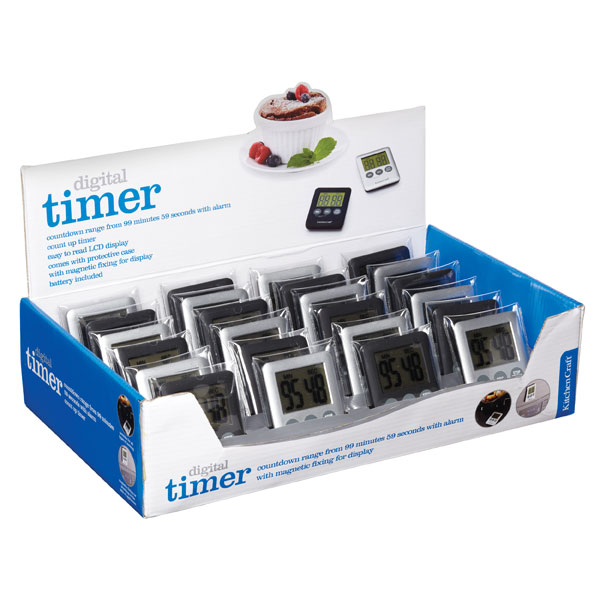 The counter top display includes twenty-four assorted black and silver coloured one hundred minute timers.