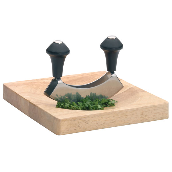 Perfect for quick, controlled slicing and chopping of herbs, spices and vegetables, this hachoir set includes a twin-handled double bladed hachoir and a sculptured beechwood cutting board. Everything you need to get your hachoir slicing started!