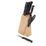 Stylishly housed in this safe wooden block, this 6 piece knife block sits perfectly on your kitchen surfaces. With the scissors placed towards the front of the block, allowing for easy access, the high quality stainless steel knives ensure clean, safe and fine cutting as well as comfortable use thanks to the handles.