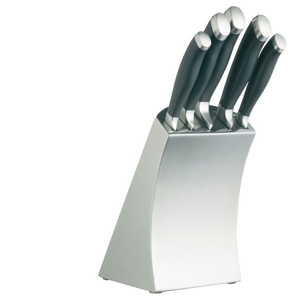 Beautifully forged from single pieces of stainless high carbon steel, these deluxe knives feature bolsters for weight, safety and balance, as well as easy to grip non-slip handles to guarantee you have a firm and comfortable hold. Stored in a sculptured designer brushed stainless steel block, the knives are all precision ground for easy and effective sharpening. A sight to see in any kitchen, the Trojan knife block truly stands out.
