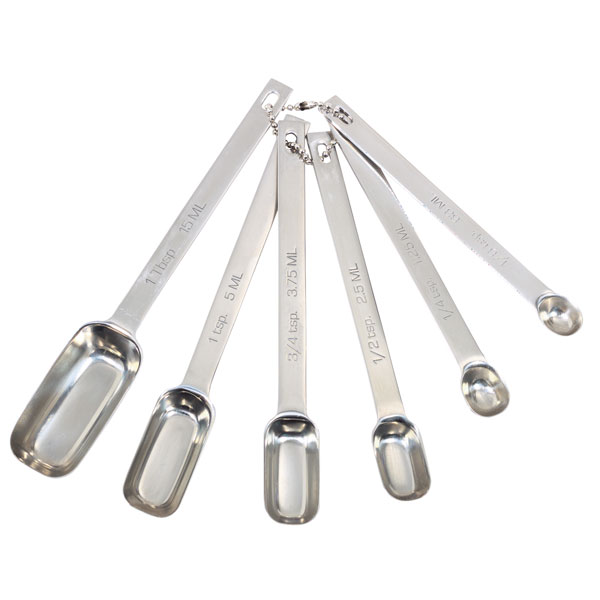 This beautiful set of six polished stainless steel long handled measuring spoons with clearly marked ml and teaspoon / tablespoon markings are all helpfully held together on a metal storage ring, reducing clutter in your kitchen. Includes 1/4, 1/3, 1/2, 3/4, one teaspoon, and one tablespoon measures.