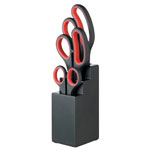 Multi-purpose set of three scissors with a three tier black wooden storage block. Each pair of scissors features stainless steel precision blades and non-slip easy to grip handles.