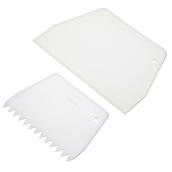 A set of two essential icing scrapers for icing cakes to perfection. Features a straight edged scraper for creating a professional smooth finish and a serrated edged scraper for creating a textured finish to cakes. Ideal for use with royal icing and buttercream.