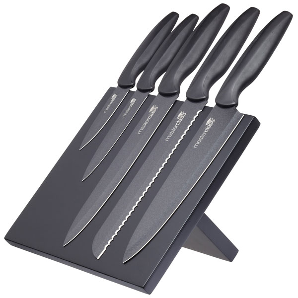 Beautifully modern, this stylish set of 5 knives with a storage stand fits perfectly into a contemporary kitchen. With a magnetic and wooden stand for safe, easy and accessible storage, this knife block sits beautifully on your work surface. Including a 20cm chef's knife, 20cm carving knife, 20cm bread knife, 12.5cm utility knife and a 9cm paring knife, all knives feature high quality stainless steel blades with a non-stick coating. With soft grip, ergonomic handles, ensure safe, efficient and comfortable use each and every time.