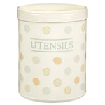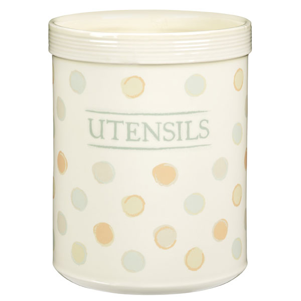 This stoneware utensil holder decorated in a neutral, soft polka dot pattern with ribbed detailing holds a variety of utensils easily to hand and helps to keep your kitchen tidy.