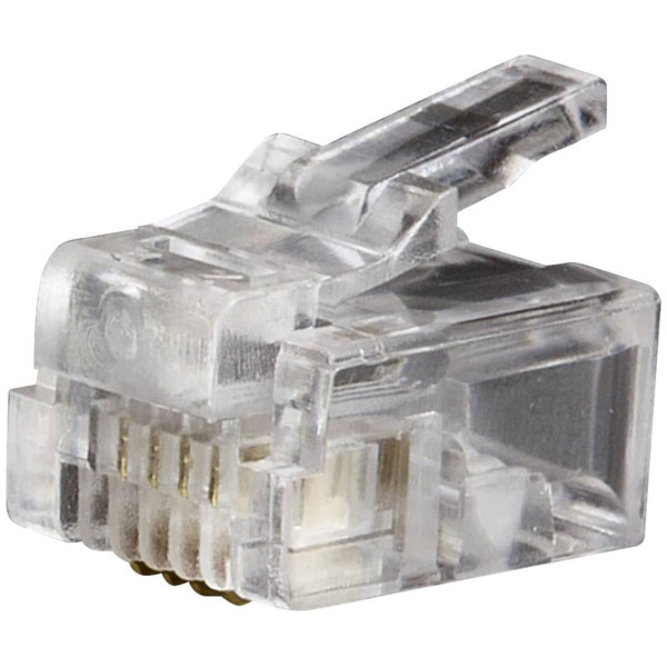 The Klein Tools VDV826-601 is a transparent RJ11 6P4C telephone plug. It features six pins with a four-contact configuration, commonly used for connecting telephone lines. Ideal for telecommunications applications, this connector is suitable for professionals needing reliable voice and data connections.