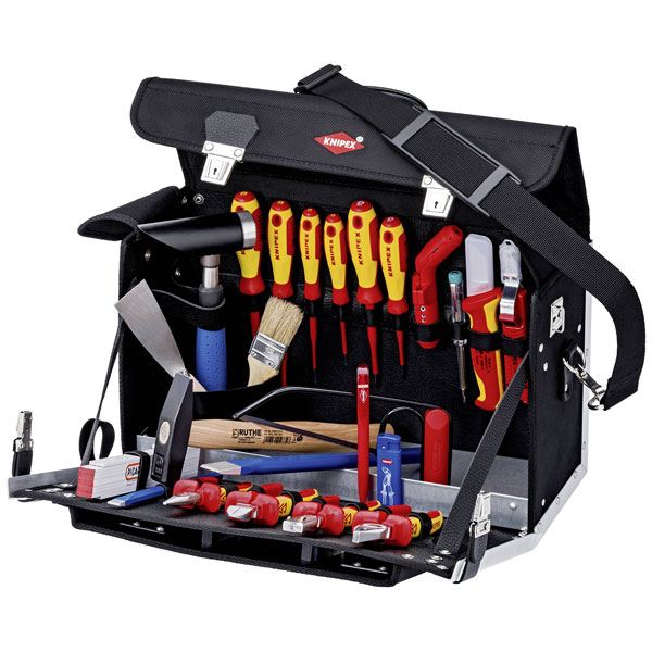 00 21 02 EL Tool Bag "Classic" ElectricEquipped with 23 brand tools, partly VDE-tested according to DIN EN 60900. Light design made of hard-wearing, reinforced polyester fabric. Front additionally reinforced with aluminium brackets. Semi-fold-out front with adjustable loops and exterior document compartment. With galvanized steel base tray. With carrying handle and adjustable shoulder strap. Dimensions, exterior (W x H x D): 440 x 270 x 180 mm.