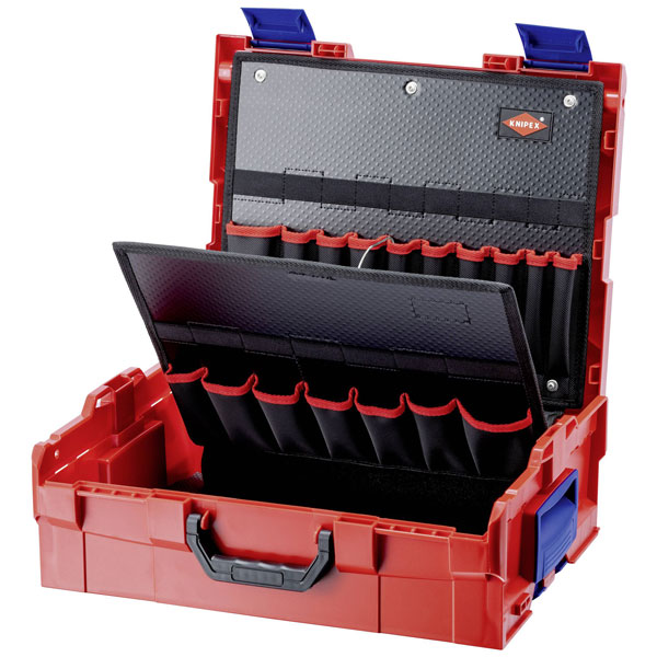 00 21 19 LB KNIPEX L-BOXX®With a total of 48 inserting options. Max. payload: 25 kg. Splash-proof. Several boxes can be securely joined together. Flexible inner partitions. Handle can be lowered into a hollow in the lid to save space. Ergonomically shaped handles with additional moulded recess on the side for flexible, convenient handling. With two-piece tool board made from dirt-repellent PP twin-wall sheets. Tool boards are connected to each other using hook-and-loop. Cover part with ten pockets and ten elastic straps. Top of base part with seven pockets and tab for hanging up the tool board; can also be used to lift and set up the L-BOXX®. Bottom of base part with 7 pockets and 7 elastic straps. Strong box made of impact- and shock-proof ABS plastic. Dimensions, exterior (W x H x D): 442 x 151 x 357 mm; dimensions, interior (W x H x D): 375 x 107 x 311 mm. L-BOXX® is a registered trademark of Sortimo International GmbH.