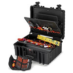 00 21 36 Tool Case "Robust34" ElectricEquipped with 26 brand tools, partly VDE-tested according to DIN EN 60900. With a total of 93 inserting options. Max. payload: 25 kg. Volume: 34 litres. For the toughest conditions: Dust-tight, waterproof and temperature-resistant. Fit-to-fly case, made from impact-resistant polypropylene. Dustproof and watertight. Air pressure compensation valve. Temperature-resistant from - 30°C to +80° C. Padlock eyelets. Document compartment; tool boards made from dirt-repelling twin-wall PP sheet with 42 tool pockets and 67 tool straps. Lockable base tray can be individually divided using aluminium separator system. Ergonomic dual-component handle. Base tray with aluminium separators. Dimensions, exterior (W x H x D): 510 x 419 x 215 mm dimensions, interior (W x H x D):480 x 356 x 199 mm. equipped with 26 brand tools; some VDE tested in accordance with DIN EN/IEC 60900.