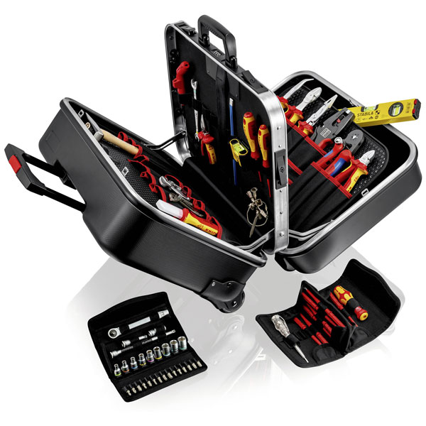 00 21 41 Tool Case "BIG Twin Move" ElectricEquipped with 14 KNIPEX tools, a total of 63 brand tools, partly VDE-tested according to DIN EN 60900. With a total of 95 inserting options. Max. payload: 30 kg. Volume: 38 litres. Base tray, can be fixed by a push button, 70 mm high, can be subdivided by inserts, cover board with 13 tool pockets. Free-standing in all opening positions thanks to snap-in cover holders with hinge mechanism on both sides, angle freely adjustable. Removable document compartment and removable tool boards made from dirt-repellent PP twin-wall sheets with 13 tool pockets. Label field with two stickers for individual labelling. Telescopic handle set in the base as well as two external, smooth-running skater wheels. Heavy duty ABS material, black. Circumferential aluminium frame with securely mounted, sturdy centre wall that can be fitted on both sides, with versatile inserting options due to elasticated loops and twelve small pockets. Metal hinges. Three-digit combination lock for secure locking of the case. Two metal tilt locks each for fixing the cover and the base. Can be opened from one or both sides; bottom and lid can be opened independently of each other.