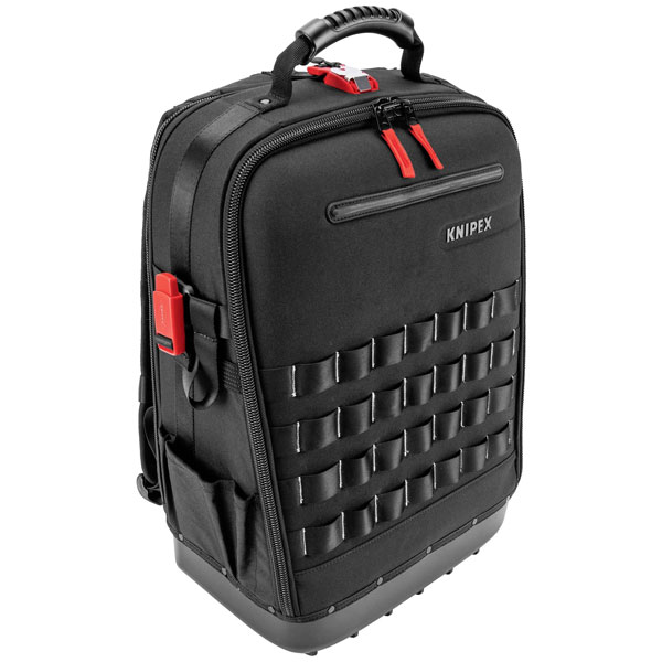 00 21 50 LE KNIPEX Modular X18Fits you and your tools: practical and comfortable due to fully hinged front and back, removable tool board and padding for your back. As individual as you are: Optimal flexibility due to innovative FIDLOCK® connectors and MOLLE webbing. Fit for any challenge: with two separate inner compartments for tools, measuring instruments, notebook or tablet. max. payload: 15 kg. Volume: 18 litres. Durable fabric made of sustainable recycled synthetic fibers, splash-proof and easy to clean. Waterproof molded bottom made of impact-resistant plastic for a secure upright position when opened and closed, 6 cm high. One MOLLE strap on the inside and four MOLLE straps on the outside for attaching any adapters, carabiners and accessories. FIDLOCK® connections are fastened or unfastened in no time at all. A total of 21 retaining loops and 37 pockets, some with zips. Luggage strap for fixing to telescopic handles of tool cases. 53 x 34 x 21 cm (H x W x D), empty weight 2.9 kg, tested load capacity up to 15 kg.