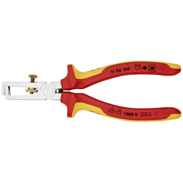 Wide-ranging team: Stripping, gripping, cutting. High-quality VDE tools in a set for professionals in the electrical industry. With universal Insulation Stripper, versatile Diagonal Cutter and flexible Stork Beak Gripping Pliers. Set of three perfectly complementary pliers for all electrical installations. KNIPEX Insulation Stripper 11 06 160 VDE with opening spring:. Adaptable: For single, multiple and fine stranded conductors with plastic or rubber insulation up to Ø 5.0 mm or 10 mm²; forged from special tool steel; oil-hardened. KNIPEX Diagonal Cutter 70 06 160 VDE:. Versatile: Also for hard wire up to Ø 2 mm, clean cut even at the tips; vanadium electric steel, forged, multi stage oil-hardened. KNIPEX Stork Beak Pliers 26 16 200 VDE:. Flexible: Snipe Nose Side Cutting Pliers with distortion-tolerant, elastic precision tips; vanadium electric steel, forged, multi stage oil-hardened.