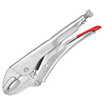 The Knipex 41 04 Series Universal Grip Pliers hold section and flat material securely. The Plier body is made from high strength spring steel, and inserted jaws are made of chrome vanadium steel, drop forged. Heavy-duty model with wire cutter. High clamping strength by elbow lever action. With adjustment screw and release lever, single hand operation.