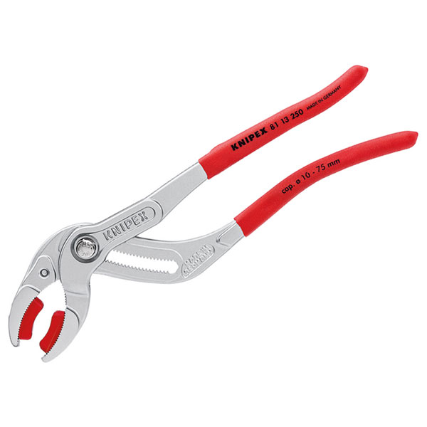 Knipex 81 13 250 SB Plastic Pipe Grip Pliers Plastic Jaws have a chrome finish.