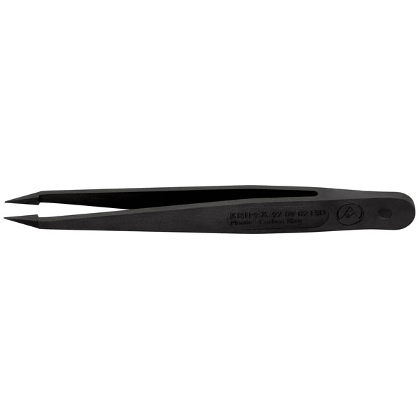 92 09 02 ESD Plastic Tweezers ESDESD tweezers are made of 30% carbon fibre reinforced plastic, are electrically and thermally highly conductive and are characterised by high resistance to abrasion and scratching. With a surface resistance between 10^2 and 10^4 ohms to compensate in a controlled manner the differences in potential between the operator and the electronic components. ESD plastic tweezers are temperature-stable up to 130° C, short-term use is possible at up to 190° C. The carbon fibre reinforced plastic of the ESD variants is extremely flexible, fatigue-resistant, vibration-reducing and water-repellent, with good chemical resistance to most oils, greases, fuels and nonpolar solvents. ESD plastic tweezers are ideal for maximum surface protection when handling sensitive electronic components, micro-mechanical parts, as well as glass and ceramic components. ESD plastic tweezers: also available as a set (92 00 05 ESD).