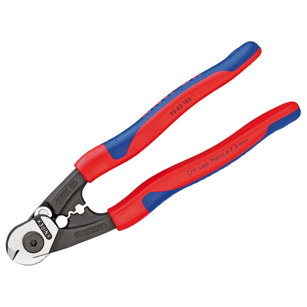 The Knipex 95 61 190 wire rope shears are ideal for medium-hard wire cables up to 7mm diameter without splaying, including those that are extremely strong, such as for example tyre cord. They also have two crimping dies for end caps on Bowden cable sheaths and end ferrules for traction cables and the blades are hardened to approximately 64HRC for added strength and durability