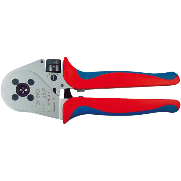 These four-mandrel crimping pliers from Knipex have been designed for crimping turned contacts. Equipped with a host of rich features, including the gauge to check the basic setting, chrome vanadium electric steel in special quality (oil-hardened), table for calculating the settings, pliers in a plastic case with foam insert and high operation comfort thanks to handy shape.