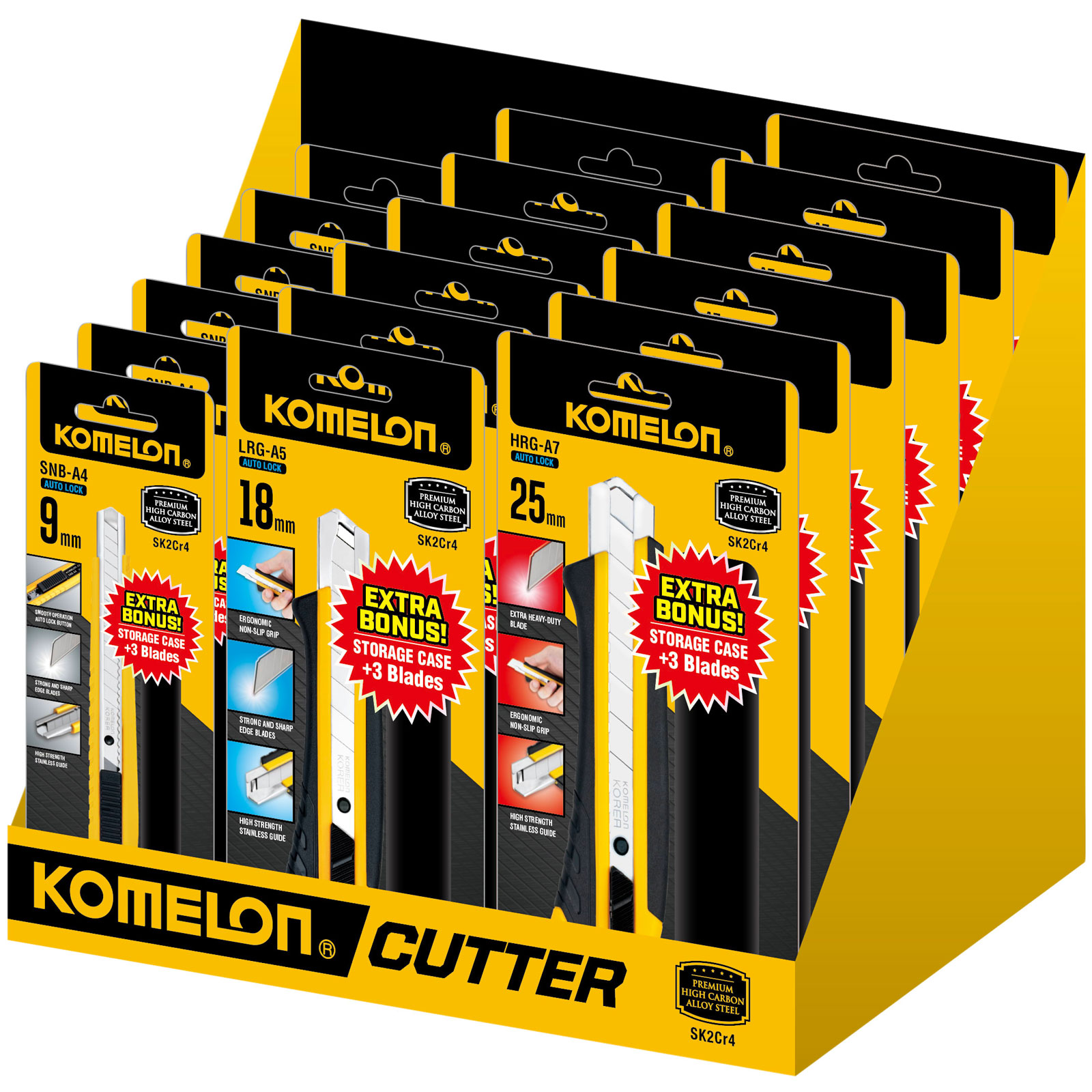 The Komelon Snap-Off Knife Counter Display Unit contains: