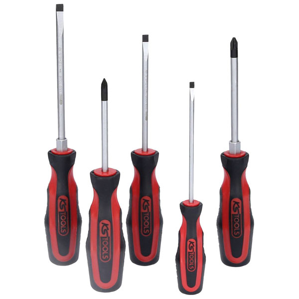 The KS Tools screwdriver set includes assorted screwdrivers designed for versatile manual tasks. Manufactured by KS Tools, this 1-piece set is ideal for precise and effective use in DIY projects and professional repairs. Suitable for both home and industrial environments, it ensures reliability and efficiency in fastening and unfastening screws.