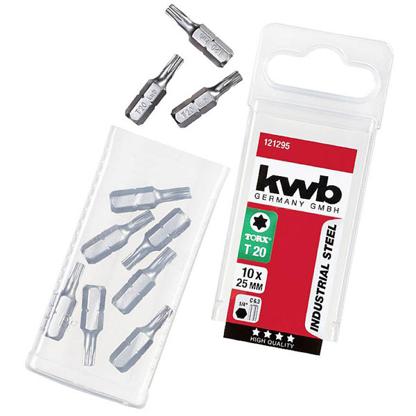The kwb 121295 TX bit set includes 10 high-quality Torx bits made of T20 steel with a C 6.3 shank. These durable bits are designed for precision work and are ideal for use with power tools in carpentry and mechanical applications. Manufactured by kwb, these bits ensure a reliable fit for Torx screws, enhancing efficiency in assembly and maintenance tasks.