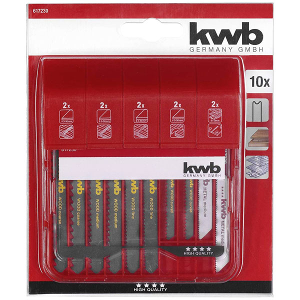 Manufactured by kwb, the 617230 jigsaw blades set is a 10-piece collection of saw blades. It is ideal for precise cutting in various materials such as wood and metal. This versatile jigsaw blade set is suitable for both professional and DIY woodworking projects.