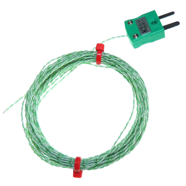 A type K thermocouple with a 5m long PFA insulated twin-twisted lead having a conductor of 1/0.315 solid wire. A welded exposed junction guarantees a fast response and the thermocouple is fitted with a miniature plug. Ideal for test and development applications.